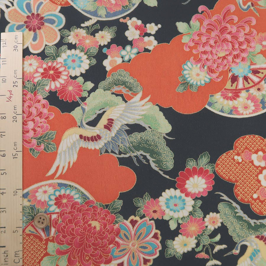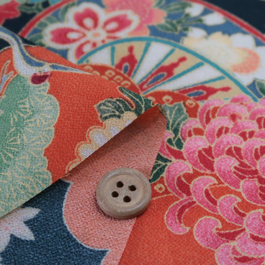 一越ちりめん生地 疋田雲に鶴と菊(黒/柿色)手芸・小物に■レーヨン100% ■約68cm幅生地の上のボタンは直径約2cmです。